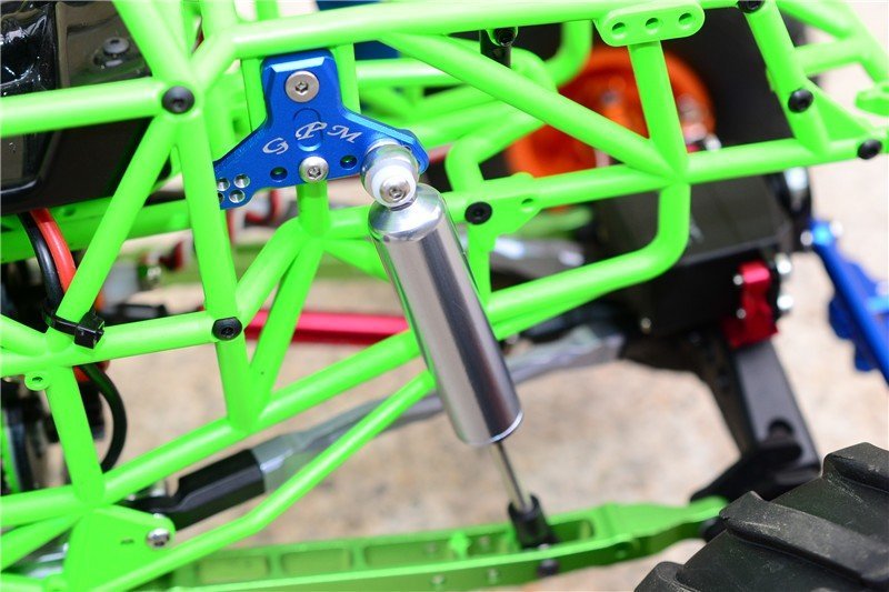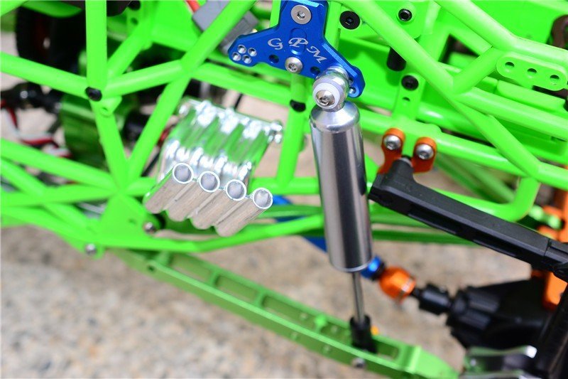 The GPM MJ125 adjustable aluminium shocks are engineered to provide adjustable ride height and articulation for the AXIAL SMT10 Monster Jam. Selectable lengths 130mm, 125mm and 123mm accommodate different chassis setups and link geometries. Internal oval springs are positioned to minimise direct impact on the shock cylinder wall, improving longevity and maintaining stable damping under repeated impacts.