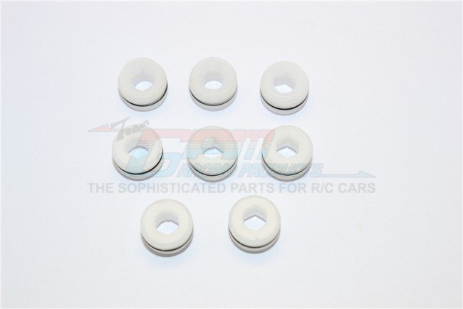 This GPM Pom Polyoxymethylene set addresses precise wheel clamping and repeatability on Traxxas E-REVO models. The cupped seat ball threaded collars allow small incremental changes to wheel tightness while the rubber 'o' rings prevent unwanted axial play, providing a dependable setup that is straightforward to service and inspect.