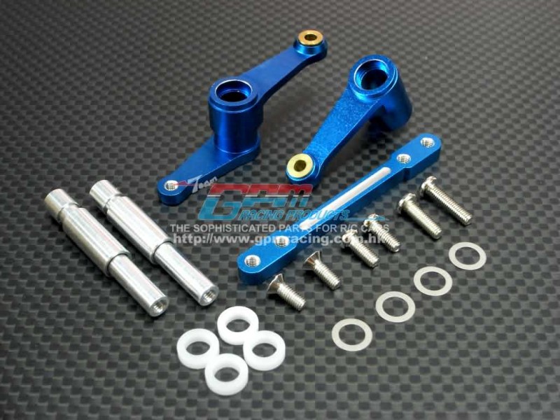Produced from a durable alloy, this steering kit improves the mechanical interface for steering bearings and linkages. Bearings are not included; the kit contains screws, shims and collars to ensure correct spacing and fit during installation. This part is aimed at experienced hobbyists seeking a robust upgrade path.