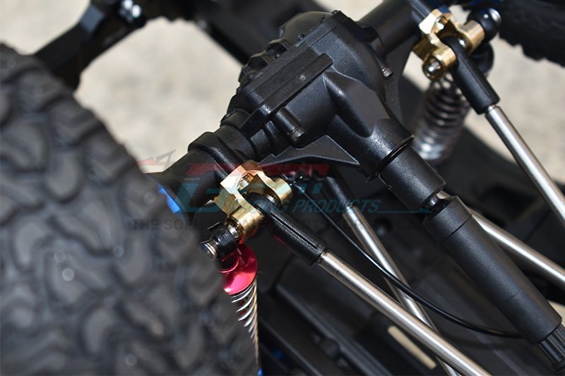 This GPM brass rear axle mount is engineered to reinforce the lower link and shock attachment points on Traxxas TRX4 axles. The unit weighs roughly 20g and secures suspension links and damper lower ends to reduce movement at the axle pivot. Multiple threaded mounting positions provide a straightforward method to alter axle ride height and refine link geometry for specific chassis setups.