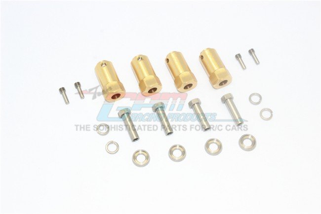 Designed by GPM for Traxxas TRX-4, these brass wheel hex adapters deliver a 23mm thickness that yields an 18mm increase in track width relative to stock components. Each adapter weighs 17g, providing balanced mass distribution and reduced wheel side play while keeping fitment straightforward with included hardware.