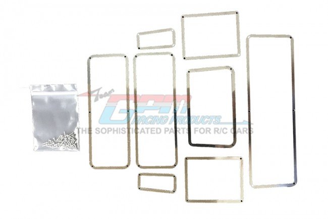 These GPM TRX4ZSP36 window frames use stainless steel construction to enhance durability and resist corrosion while providing a clean metal trim for the Traxxas TRX-4 Defender. The parts are designed to be fitted through a prepared opening, delivering a secure, tailored fit to the model.
