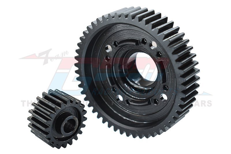 This GPM carbon steel centre differential gear set is specified for Traxxas X-MAXX 8S applications needing a durable, wear resistant replacement. The set comprises a 51T output gear and a 20T input gear made from medium carbon steel, intended to provide robust meshing and consistent drive transfer under repeated load cycles.