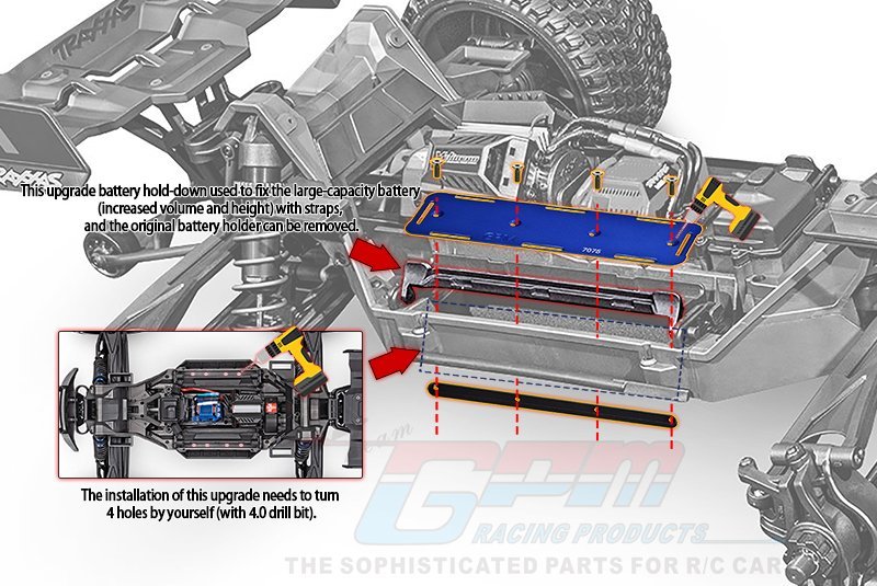 The GPM XRT0126 is a precision engineered battery hold-down set for the Traxxas XRT 8S, fabricated from 7075-T6 aluminum to provide consistent rigidity and long service life. Its open-frame layout works with the supplied Velcro straps to support a range of battery sizes while enabling straightforward fastening and removal during maintenance or setup changes. The kit components are arranged for reliable fitment and repeatable positioning on the vehicle chassis.
